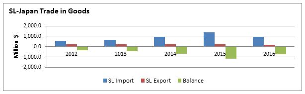 日本は、スリランカの重要な貿易パートナー国であり、スリランカの2016年の総貿易の3.8%、総輸出額の1.9%をを占めています。