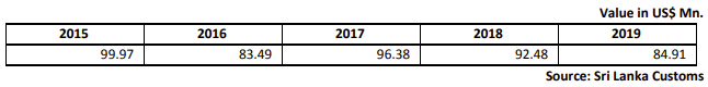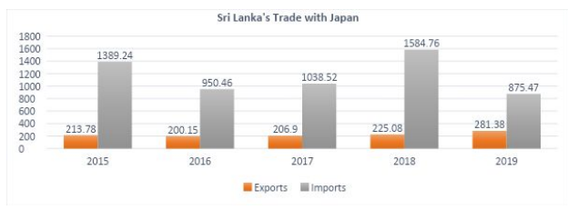 Japan was the largest supplier to Sri Lanka until late 1990s. In 2001, India surpassed Japan as the main supplier. From 2017 to 2019 Sri Lanka’s exports to Japan shows a positive trend. The Balance of Trade between the countries has been in favor of Japan. The value of imports which stood at 1,584.76 US$ Mn in 2018 decreased to 875.47 US$ Mn in 2019 by 44.75% compared to 2018.