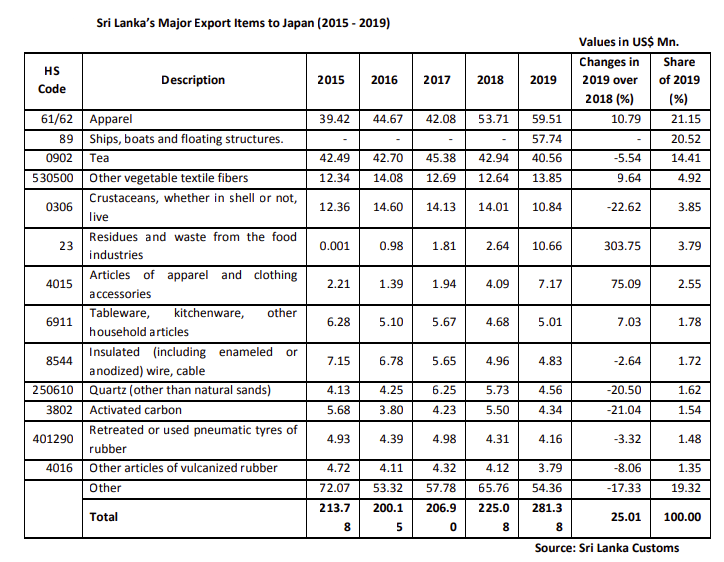 Japan was the 8 th export market for Sri Lanka with a share of 2.39% in 2019. In 1977, Japan was Sri Lanka’s 6 th export market with a share of 5.21%. Apparel was the dominant export item from Sri Lanka to Japan accounting for 21.15% of total exports to Japan in 2019.